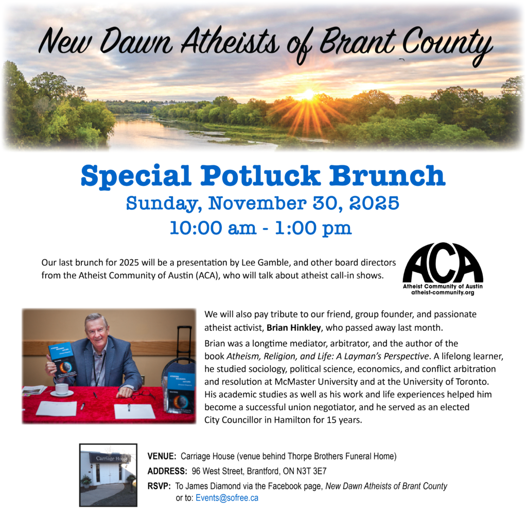 RSVP to: James Diamond via the New Dawn Atheists of Brant County Facebook page at: https://www.facebook.com/groups/3159854437606124 or to: Events@sofree.ca