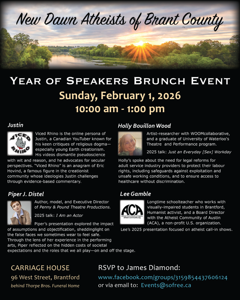 Brunch in Brantford with Guest Speakers π° βοΈ 1 February 2026 - 10:00 amJoin us in Brantford for a special brunch! RSVP to James Diamond either via Facebook at: https://www.facebook.com/groups/3159854437606124 or via email to: Events@sofree.ca
